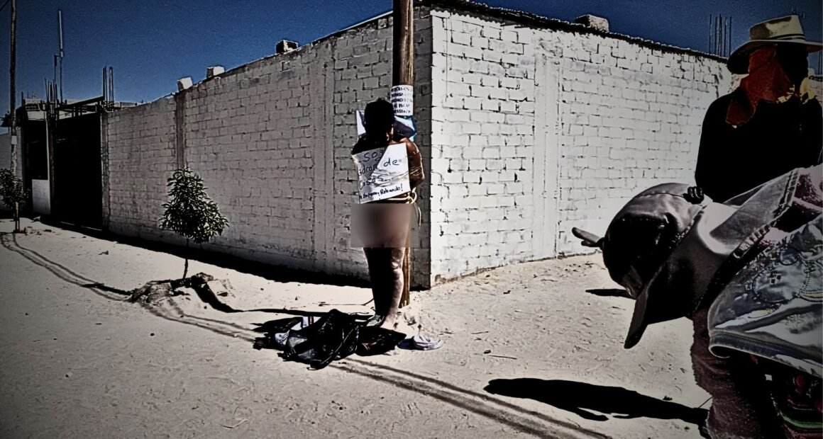 Cansados de los robos, los vecinos golpearon y desnudaron al ladrón, colocándole un cartel que decía “Soy ladrón. Me atraparon robando” en un poste.