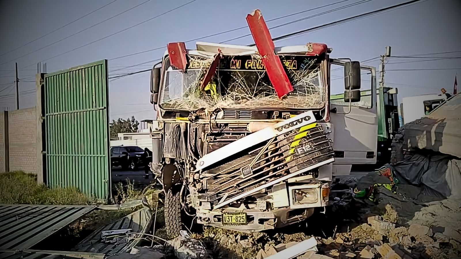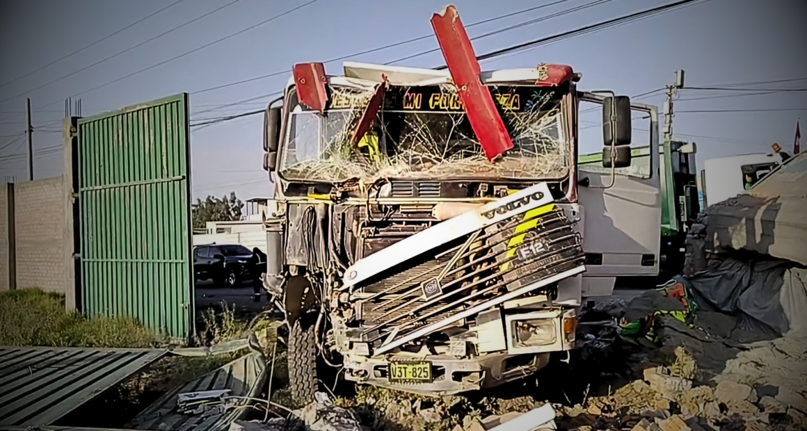Según las primeras informaciones, un volquete con doble carrocería, de placa V3T-825, chocó violentamente contra un auto de placa D7G-241. Este impacto provocó que el vehículo pesado colisionara contra una puerta de metal y un muro de concreto de un terreno agrícola en la zona.