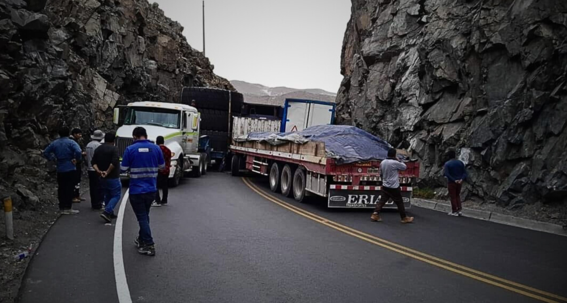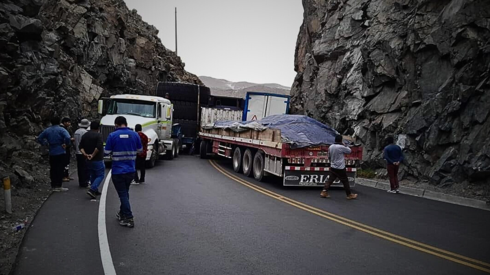 Un camión trató de cruzar la zona conocida como la “Curva del Cura” quedando atorada entre dos camiones. Gran cantidad de vehículos se encuentran varados sin poder salir ni ingresar de la ciudad de Arequipa.
