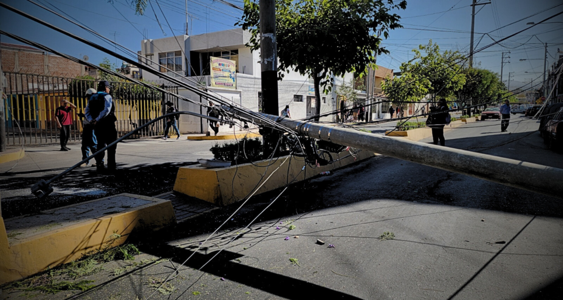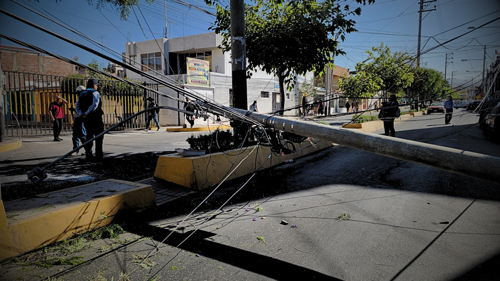 Algunos postes terminaron colgando sobre los cables de energía y telecomunicaciones, causando peligro para los vecinos. En varias viviendas, los medidores de luz se desprendieron por el impacto, dejando sin electricidad a numerosas familias en la zona afectada.