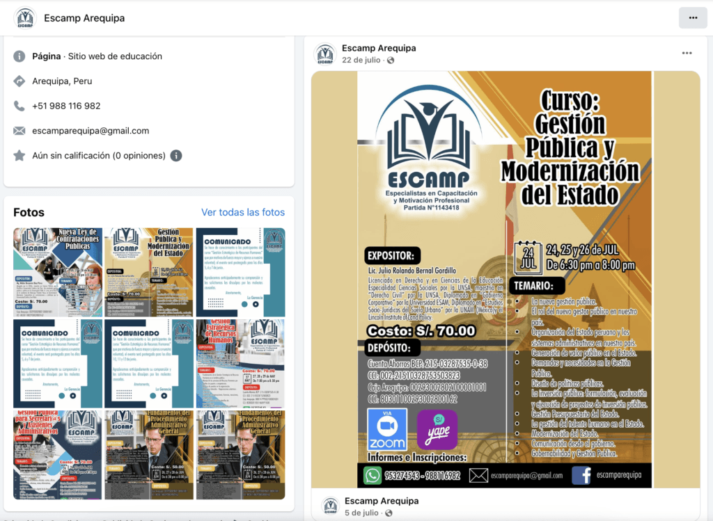 Revelación.pe se comunicó con los números que aparecen en los ‘flyers’ de Facebook. La asesora de ventas señaló que el curso regular no supera las 100 horas académicas y se dicta mediante la plataforma virtual Zoom. “Normalmente los cursos son de 96 horas. Todos los meses se realizan capacitaciones. Son cursos de capacitación que los dictan especialistas al margen de la Sunedu”, explicó a este medio.