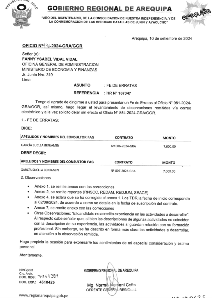 A pesar de las reiteraciones para que la gestión de Rohel Sánchez absuelva las observaciones, recién el 10 de setiembre respondieron. Através del oficio N° 996-2024-GRA/GGR, presentó una Fe de Erratas para subsanar las observaciones que hizo el MEF. Tras este intento fallido, el GRA acomodó los términos de referencia y respondió: “Si bien las descripción de algunas actividades no coinciden con la descripción de su experiencia, las actividad si guardan relación con su formación profesional. Se ha descrito en forma más clara las actividades a desarrollar”.
