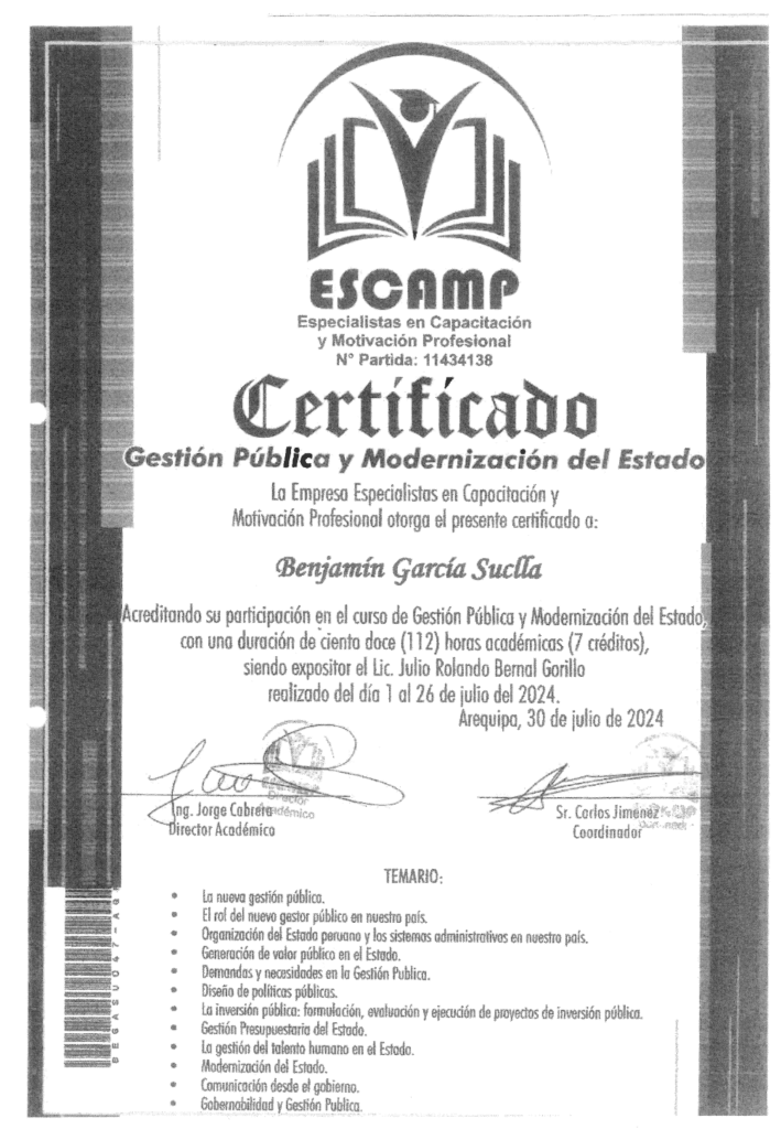 A diferencia de otros profesionales, Benjamin García no la tuvo tan complicada. En su currículum, anexó el certificado de la empresa de Especialistas en Capacitación y Motivación Profesional (ESCAMP). La constancia acredita su participación en el curso de “Gestión Pública y Modernización del Estado” y tiene un peso académico de 7 créditos.