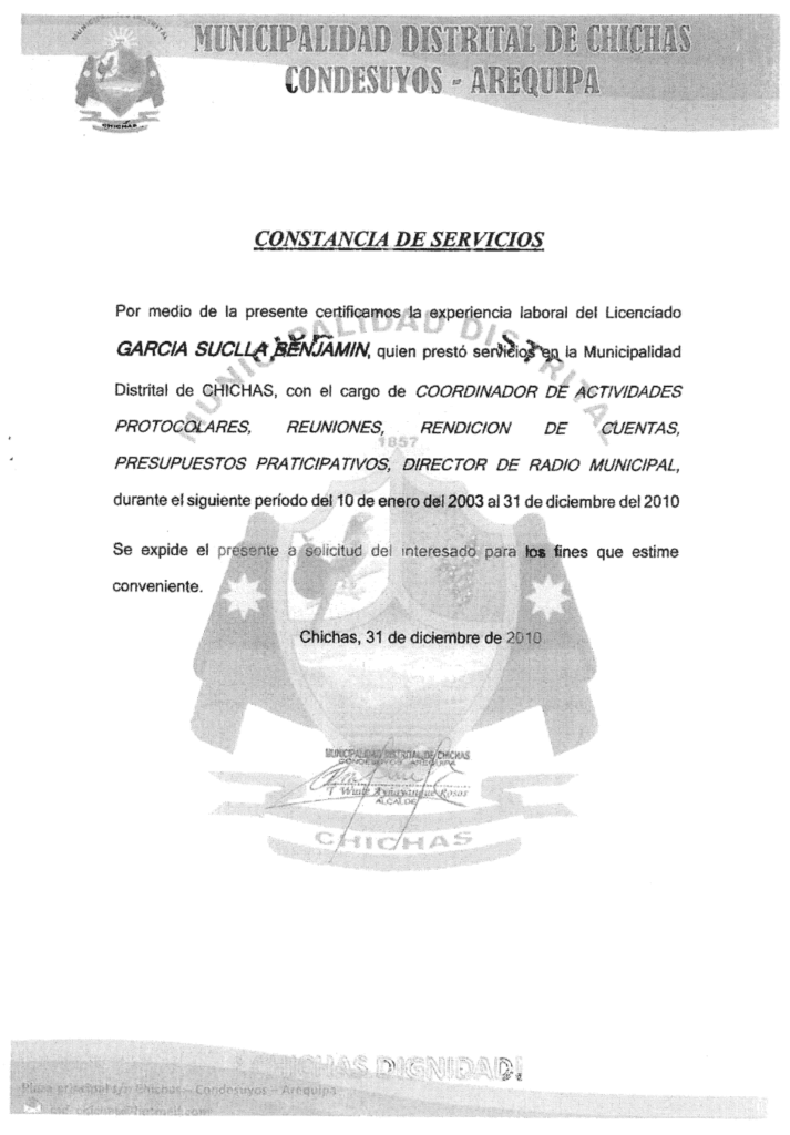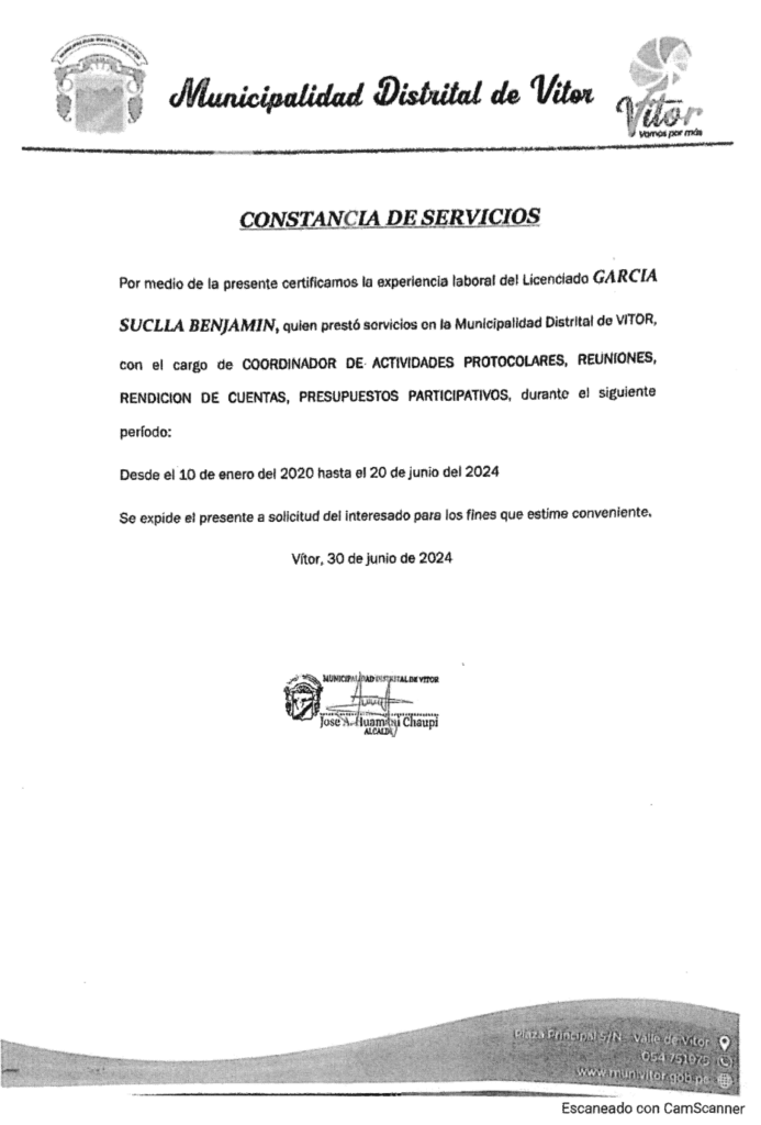 En la constancia de servicios otorgada por la comuna de Vitor, el alcalde José Huamaní Chaupi certifica la experiencia laboral de Benjamin García como “Coordinador de actividades protocolares, reuniones, rendición de cuentas y presupuestos participativos”. Sus labores, aseguran, se desarrollaron desde el 10 de enero del 2020 al 20 de junio del 2024. Este medio llamó en reiteradas ocasiones al burgomaestre, pero no contestó.