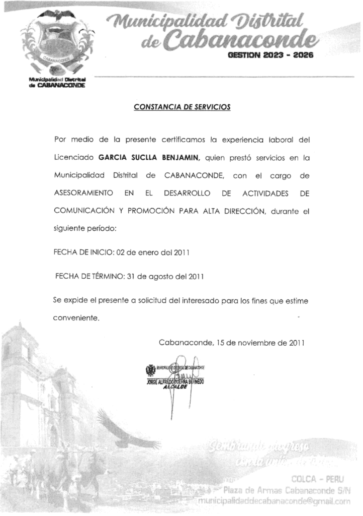 Del mismo modo, la Municipalidad Distrital de Cabanaconde acreditó sus labores de “asesoramientos en el desarrollo de actividades de comunicación y promoción para la alta dirección”, durante el periodo del 2 de enero al 31 de agosto del 2011. La constancia fue firmada por el actual alcalde Jorge Alfredo Guerra Bernedo, a pesar de que fue emitida el 15 de noviembre del 2011. Incluso el documento tiene membrete de la gestión 2023-2026. Además, el portal de proveedores no registra ningún servicio en dicha jurisdicción.