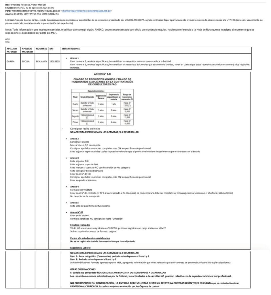 Luego de recepcionar los documentos, el 20 de agosto el MEF envió una serie de observaciones a la gestión regional vía correo electrónico. El documento completo lo adjuntamos, pero se puede resumir en «No acredita experiencia en las actividades a desarrollar»; titulo no registrado en SUNEDU y recomienda hacer el trámite; no se registró los cursos y/o estudios de especialización; y, sobre todo, «No corresponde su contratación. La entidad debe solicitar dejar sin efecto la contratación. Tener en cuenta que es contratación de un profesional calificado, lo cual está sujeto a los órganos de control», advierte al final de ese correo.