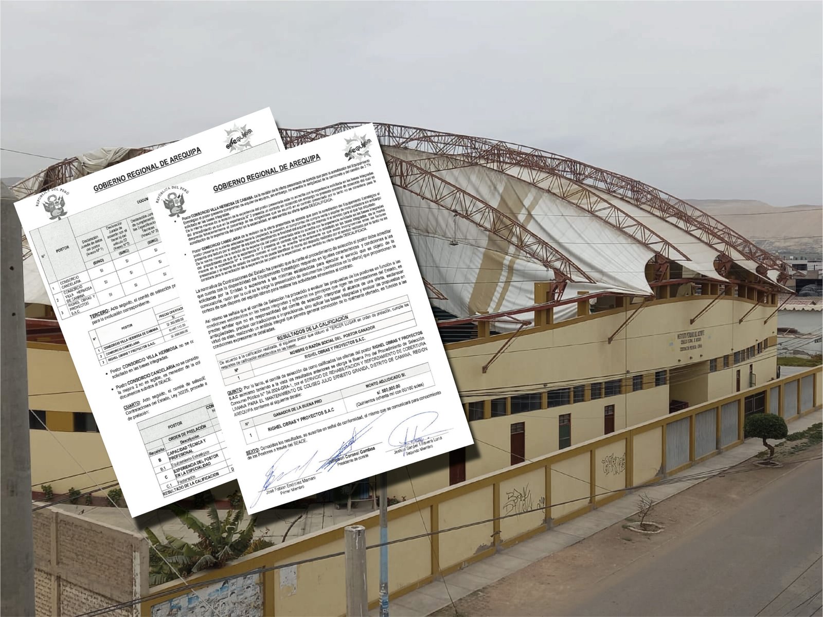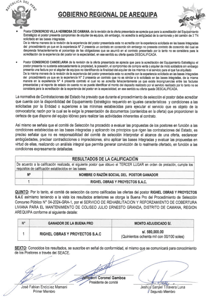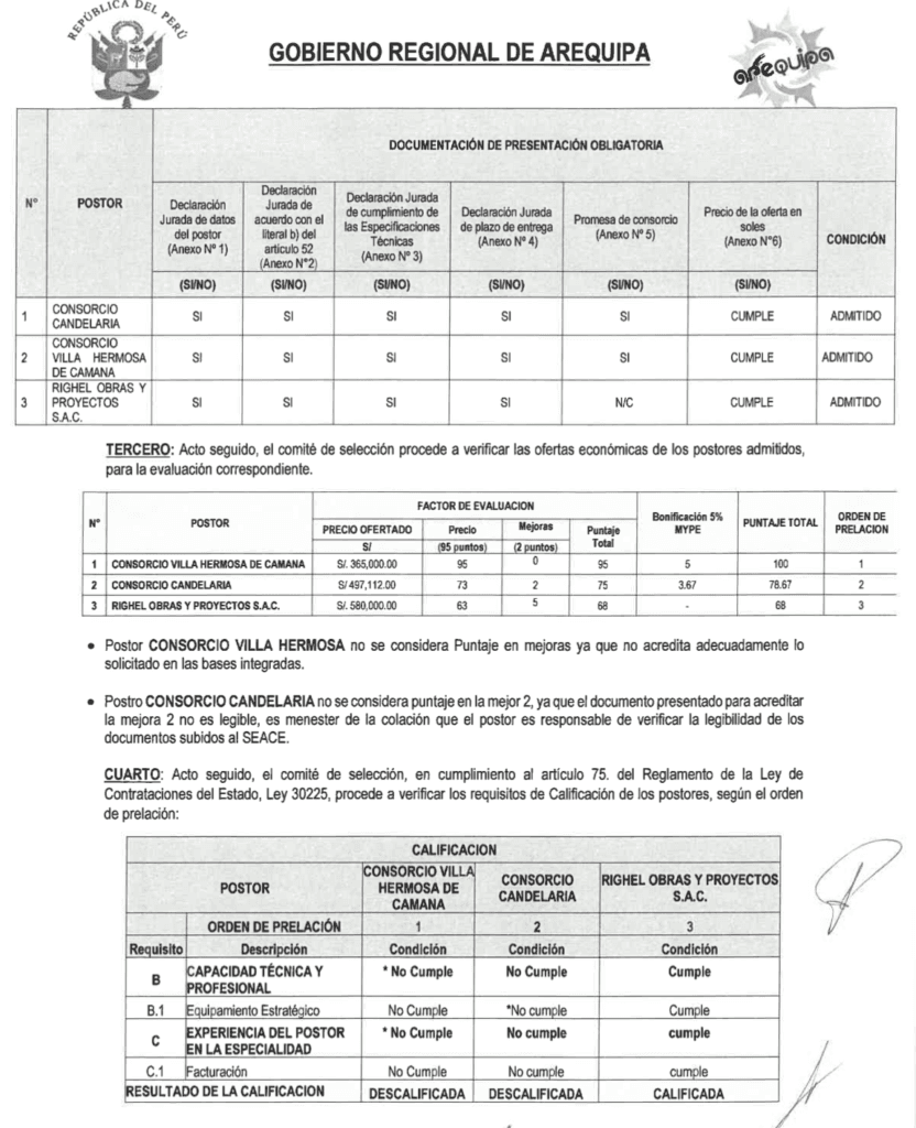 Sucede que participaron los consorcios Candelaria, Villa Hermosa de Camaná y Righel Obras y Proyectos SAC. Estos fueron admitidos durante la postulación al cumplir todos los requisitos. Por ende, la licitación N° 04-2024-GRA recaería sobre la compañía con la menor oferta económica, pero la situación fue diferente.