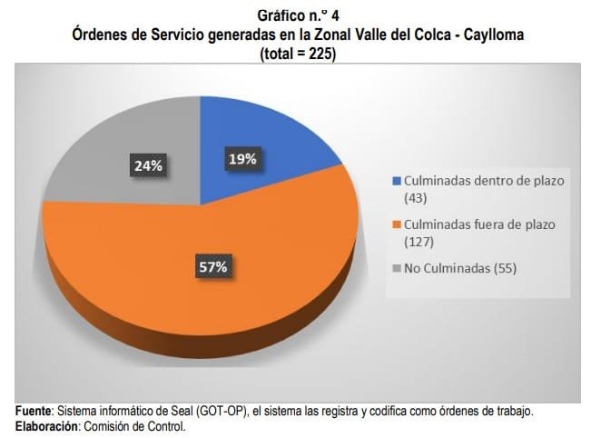 El informe señaló que el Consorcio Copemane cumplió 1,341 órdenes de servicio, fuera de plazo. Y dejó 1,143 órdenes inconclusas, fuera del plazo establecido. Estos incumplimientos afectaron directamente la atención de emergencias, el alumbrado público y la ampliación de redes eléctricas. En Mollendo-Islay y el Valle del Colca-Caylloma, aproximadamente el 57 % de las órdenes se ejecutaron fuera del tiempo estipulado.