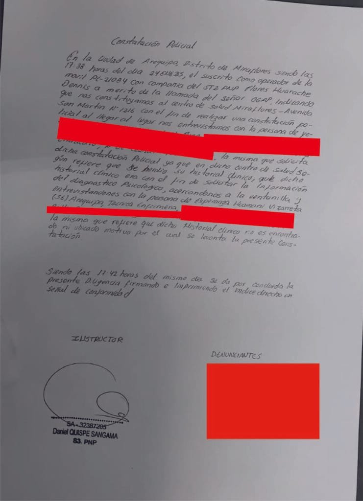 “Fui en reiteradas ocasiones al Centro de Salud Miraflores para solicitar el diagnóstico psicológico. Me dijeron que lo iban a buscar porque lo habían perdido. También les pedí una copia porque siempre queda en el sistema, pero me di con la sorpresa de que lo han borrado. Es como si yo nunca hubiera llevado mi terapia psicológica”, contó la denunciante a Revelación.pe.