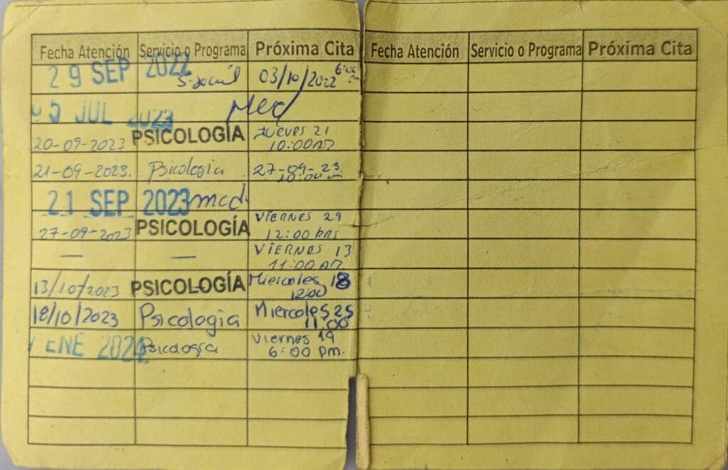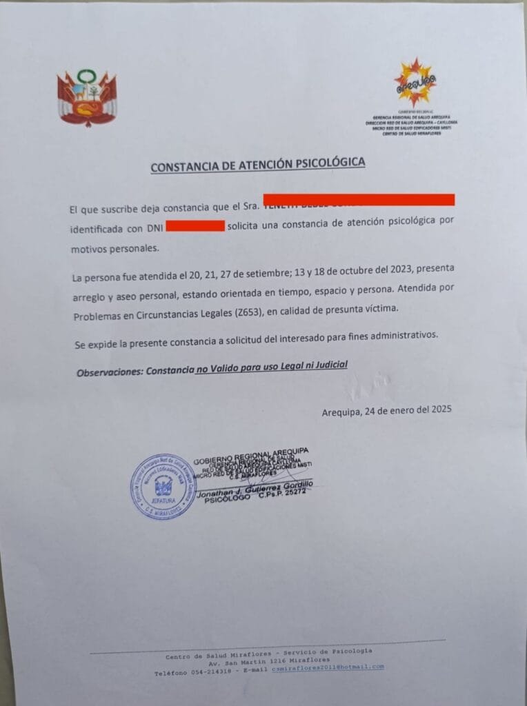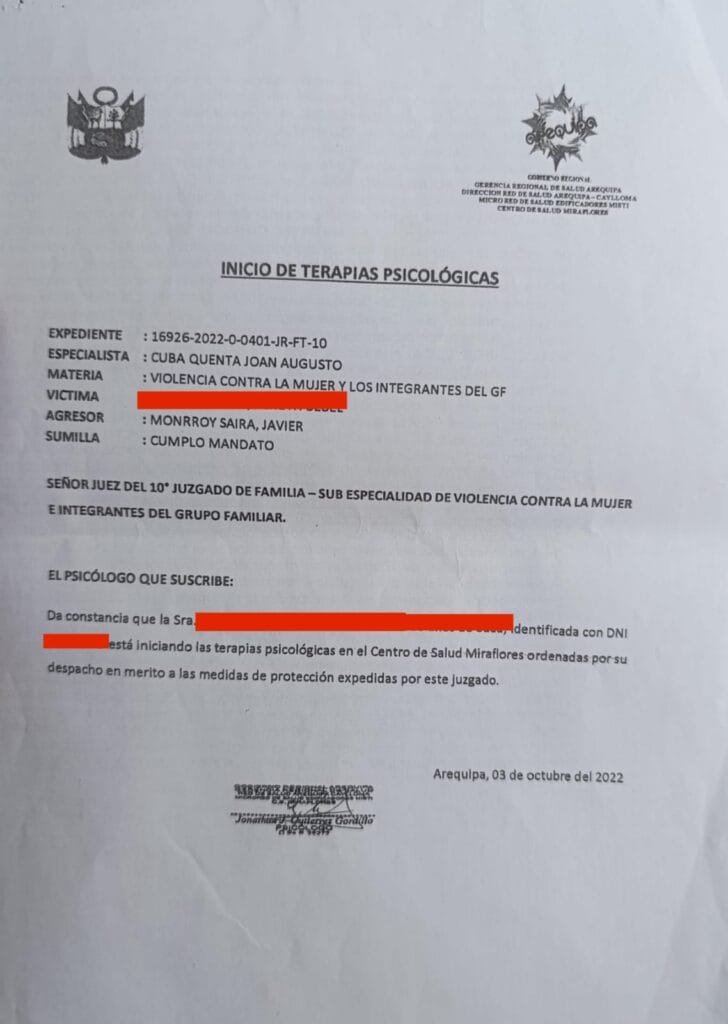 Es así que, el 3 de octubre del 2022, la afectada empezó su tratamiento en el Centro de Salud Miraflores ordenadas por el despacho en mérito a las medidas de protección expedidas por el Juzgado. Dicha constancia de inicio de terapias fue emitida por el médico psicólogo Jonathan Gutiérrez Gordillo al Poder Judicial. Yeneth acudió a sus citas y terminó su tratamiento. Sin embargo, ahora ya no queda rastro de su historial en el sistema del establecimiento de salud.