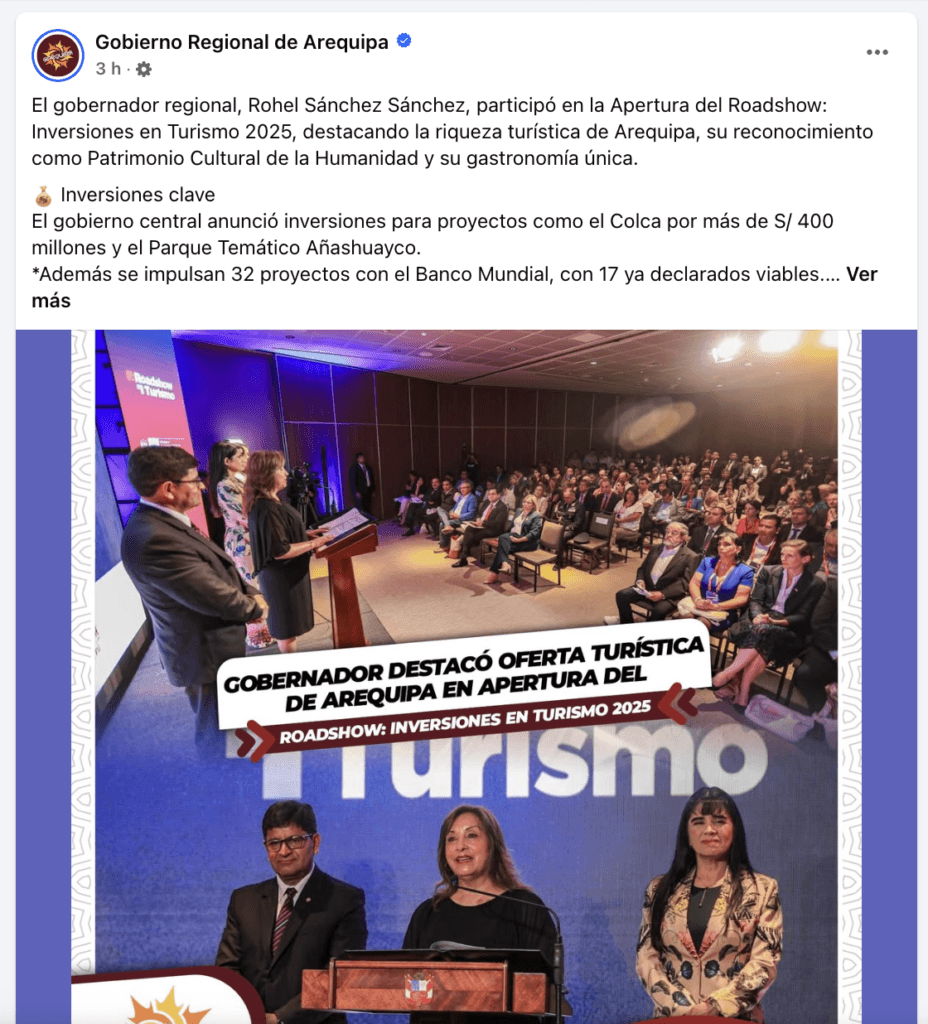 Es por eso que resultó sorpresivo que el gobernador aparezca en un evento oficial en Lima, donde, según una nota de prensa del área de imagen del gobierno regional, Sánchez estuvo en la Apertura del Roadshow: Inversiones en Turismo 2025. En donde destacó la riqueza turística de la región. Hay fotos donde aparece a lado de la presidenta Dina Boluarte frente a la audiencia del evento. Cumpliendo funciones como gobernador, tal como lo resaltan en la nota de prensa.