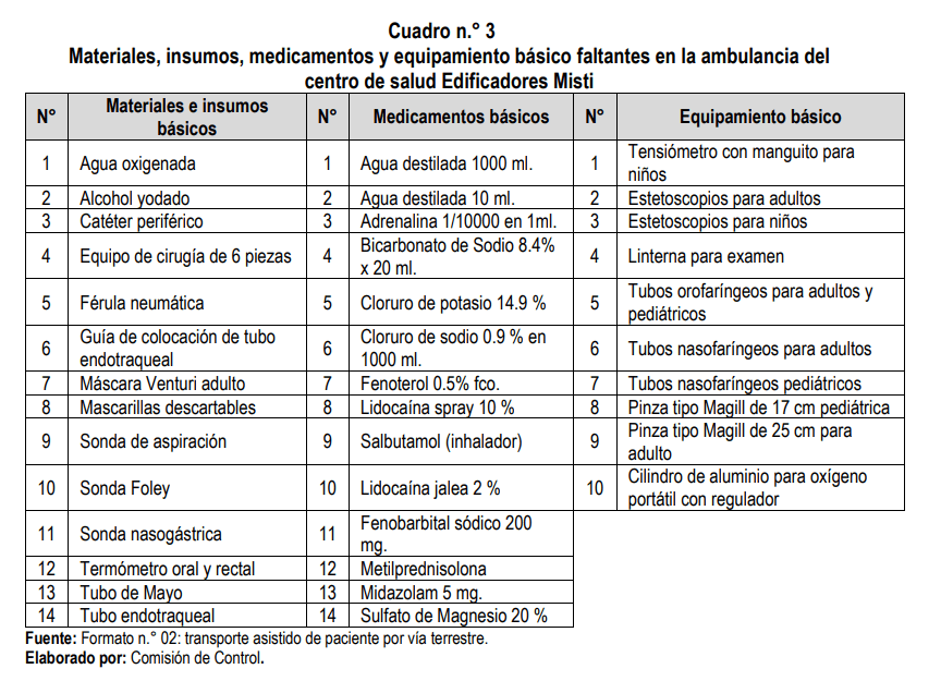 Mientras estos establecimientos cuentan con equipos sin usar, también carecen de material mínimo para atender emergencias. De acuerdo a la inspección desarrollada por la Contraloría, en tres establecimientos de la microrred Edificadores Misti (Edificadores Misti, Miraflores y Mateo Pumacahua), entre el 23 y 24 de enero de este año, los tópicos no cuentan con equipamiento básico para urgencias (ver cuadro).