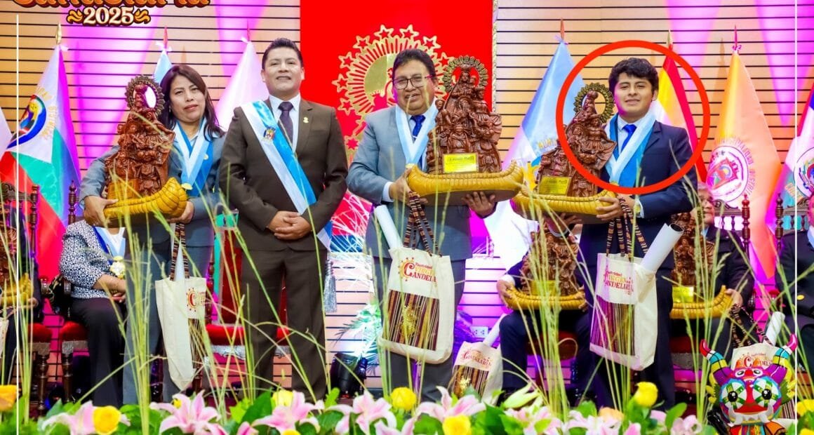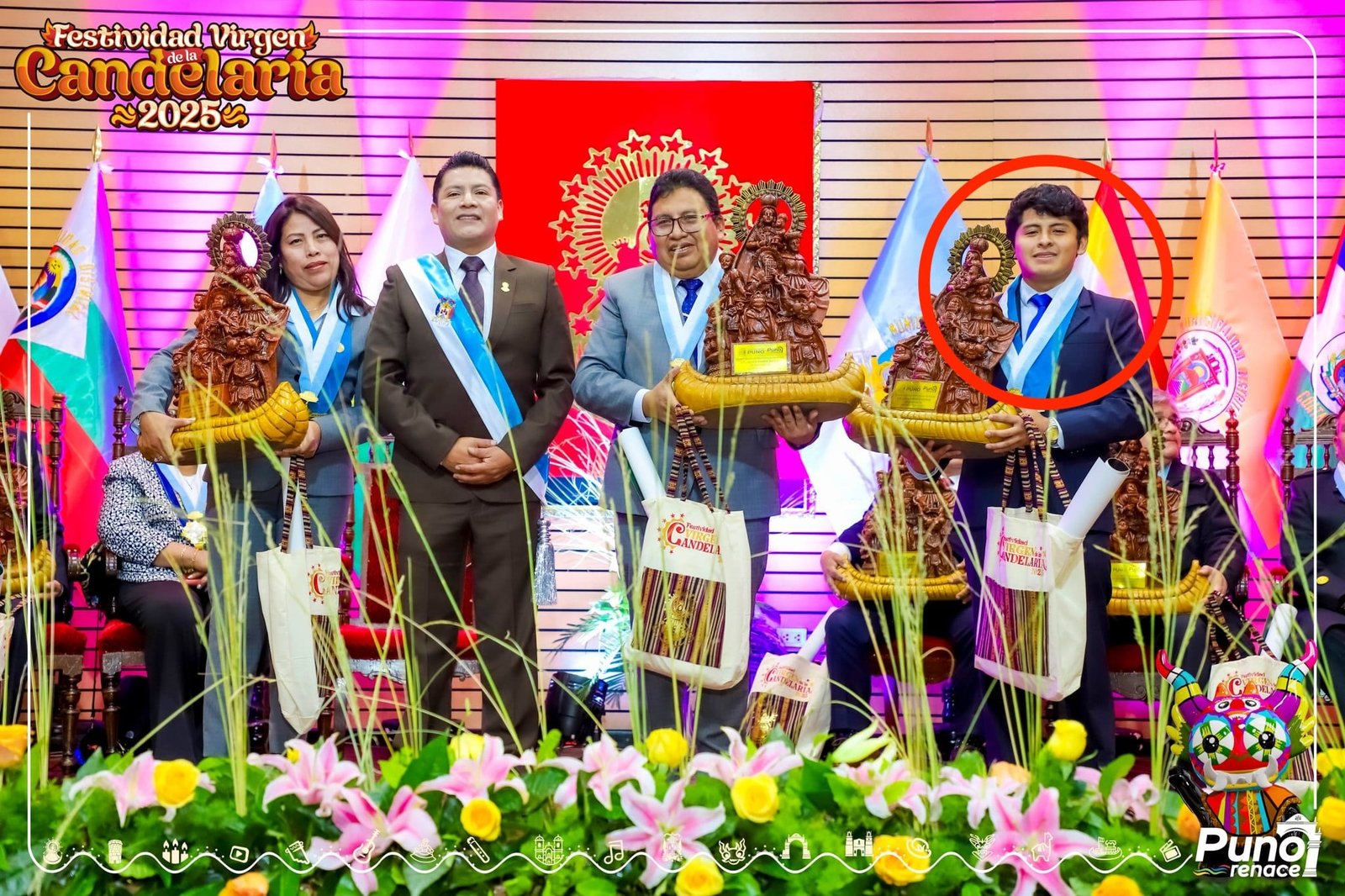 A Adrian Satana tampoco se lo ve entre los asistentes. En su lugar Richarts Calizaya, con la medalla de regidor de su padre, sube al estrado y es galardonado. Primero recibe la medalla de honor de la ciudad de manos del alcalde Javier Ponce. Y luego la una estatua de la Virgen de la Candelaria y otros presentes.