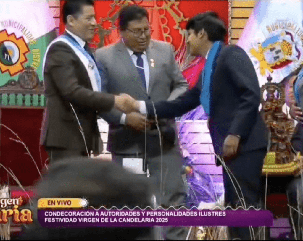 Aquí Richarts Calizaya dando la mano al alcalde de Puno Javier Ponce y usando la medalla de regidor de su padre.