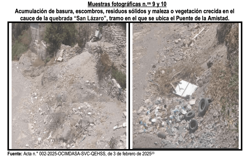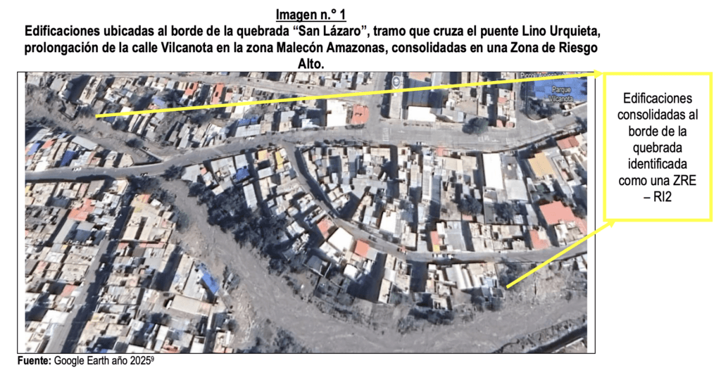El primer punto inspeccionado fue la torrentera San Lázaro. Allí «se constató la existencia de edificaciones al borde de la quebrada y la inexistencia de intervenciones para el encauzamiento o defensa ribereña ante la entrada de avenidas extraordinarias», dice el documento respecto a la parte alta de la torrentera. Y en la parte baja la situación es similar. Se encontró «edificaciones al borde