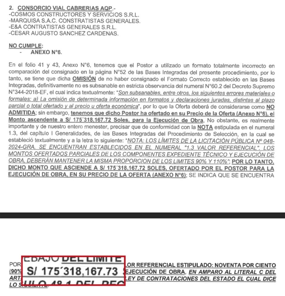 La semana pasada Revelación.pe evidenció incongruencias en los límites inferiores de la licitación de la obra vial Cabrería – Pampa Cañahuas. Y es que los números referenciados por el comité de selección no cuadran con la cifra que se puso en las bases administrativas para el concurso. Sin embargo, esta no es la única obra donde ha pasado lo mismo, evidenciando que las bases administrativas se están entregando para inducir al error a postores, ganando otros con ofertas mayores.