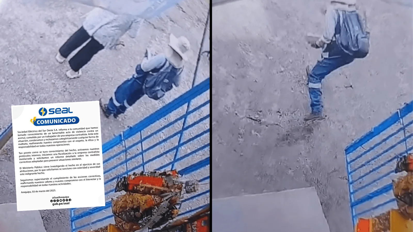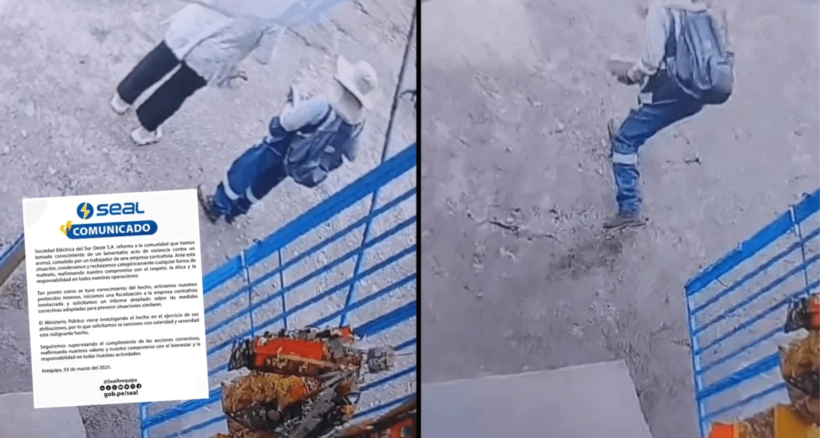 Un trabajador de una empresa contratista de SEAL (Servicio de Electricidad de sel Sur Oeste de Arequipa) fue captado en video agrediendo brutalmente a un perro callejero en el distrito de Miraflores, Arequipa. El hecho ocurrió en la zona de Juan XXIII, donde el hombre, identificado como Randolph D.C., lanzó un fierro contra la cabeza del can, causándole graves lesiones. Las imágenes, grabadas por una cámara de seguridad, muestran que el animal no representaba ninguna amenaza.