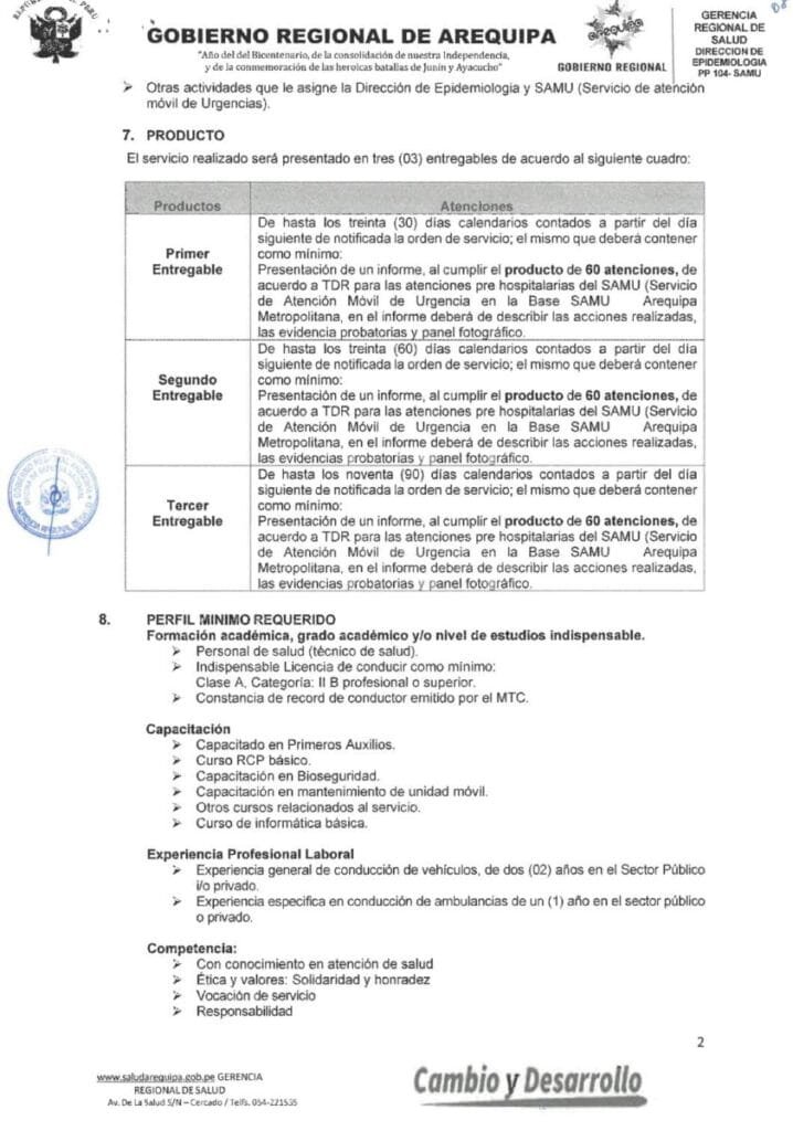 Estas acusaciones se sustentan en los Términos de Referencia (TDR) para cinco plazas para pilotos de ambulancia. Según la convocatoria, se requiere un personal de salud (técnico en salud), que cuente con licencia de conducir clase A – categoría II B y una constancia de record de conductor emitido por el Ministerio de Transportes y Comunicaciones (MTC).