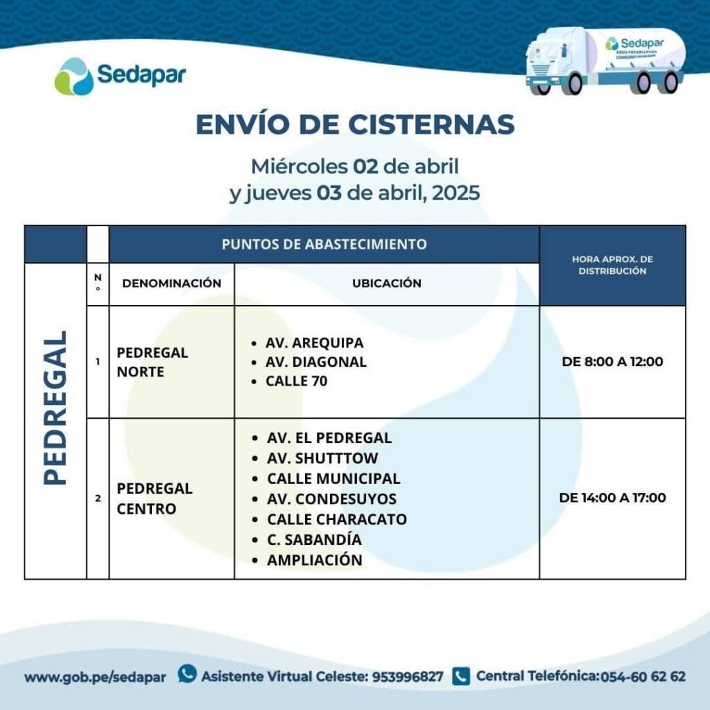 Para mitigar el impacto en los hogares de la zona, Sedapar ha dispuesto la distribución de agua potable en cisternas en los sectores de Pedregal Norte y Centro en las avenidas Arequipa, Diagonal, El Pedregal, Shuttow, Calle Municipal, Condesuyos, Characato, Sabandía y ampliación, mientras que en Pedregal Sur y Ciudad Majes el aporte dependerá del vaso regulador.