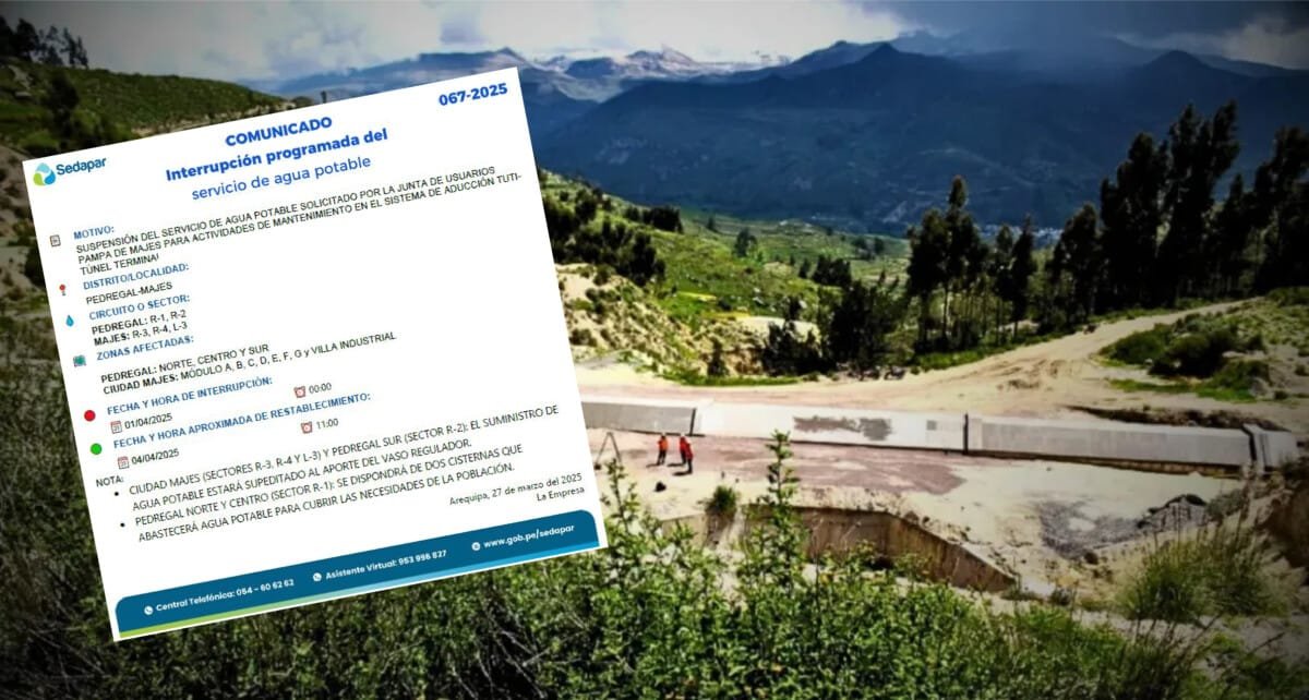 Sedapar anunció la suspensión del suministro de agua potable en los sectores de Pedregal y Ciudad Majes (distrito de Majes) desde el martes 1 de abril, a la medianoche, hasta el viernes 4 de abril, a las 11 de la mañana. La medida se toma debido a que en ese periodo se han programado trabajos de mantenimiento de la infraestructura hidráulica en el sistema de aducción Tuti-Túnel Terminal.