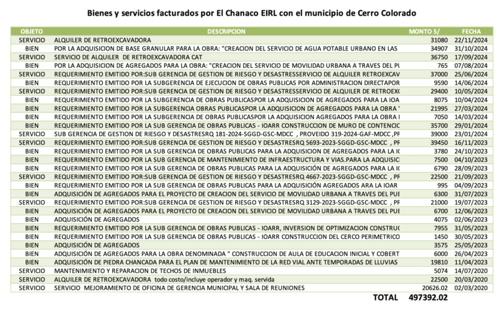 A partir del 11 de abril de 2023, Percy Martin Huaita Huanca, a través de la firma “El Chanaco E.I.R.L.”, comenzó a distribuir materiales de construcción para obras y trabajos de la comuna cerreña en la actual gestión. En total, se le adjudicaron 27 servicios afines a su rubro por un monto equivalente a 449 mil 192 soles. Es decir, gracias a ambos alcaldes se benefició con 497 mil 392 soles.