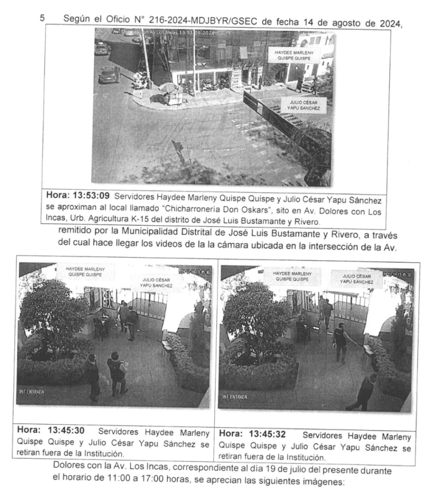 En ese tiempo, Marleny Quispe se desempeñaba como secretaria y su colega como encargado de la Unidad de Selección. Ese 19 de julio, ambos ingresaron a la sede pública minutos antes de las 8 de la mañana para desempeñar sus funciones, pero ninguno registró su salida. Sin embargo, el archivo fílmico de las cámaras de seguridad de la entidad reveló que salieron a la 1:45 de la tarde, y sin justificación. Y es que no informaron sobre alguna diligencia oficial a realizar y tampoco pidieron permiso por temas personales.