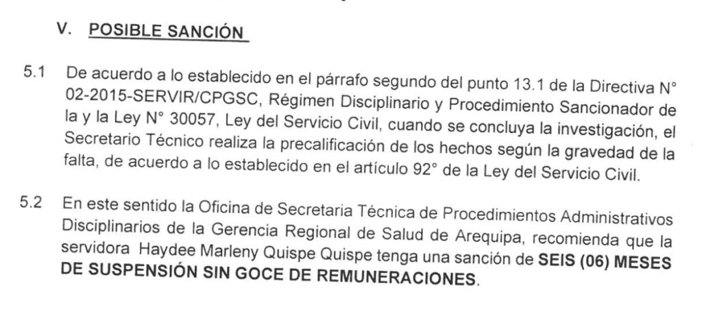 Lejos de ser sancionados, ahora gozan de impunidad. La Secretaría Técnica de la Geresa, en atención a los fundamentos expuestos e indicios encontrados en su momento, recomendó la disposición del inicio del procedimiento administrativo disciplinario en contra de Haydee Quispe Quispe.