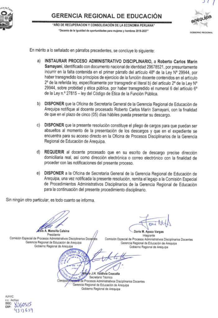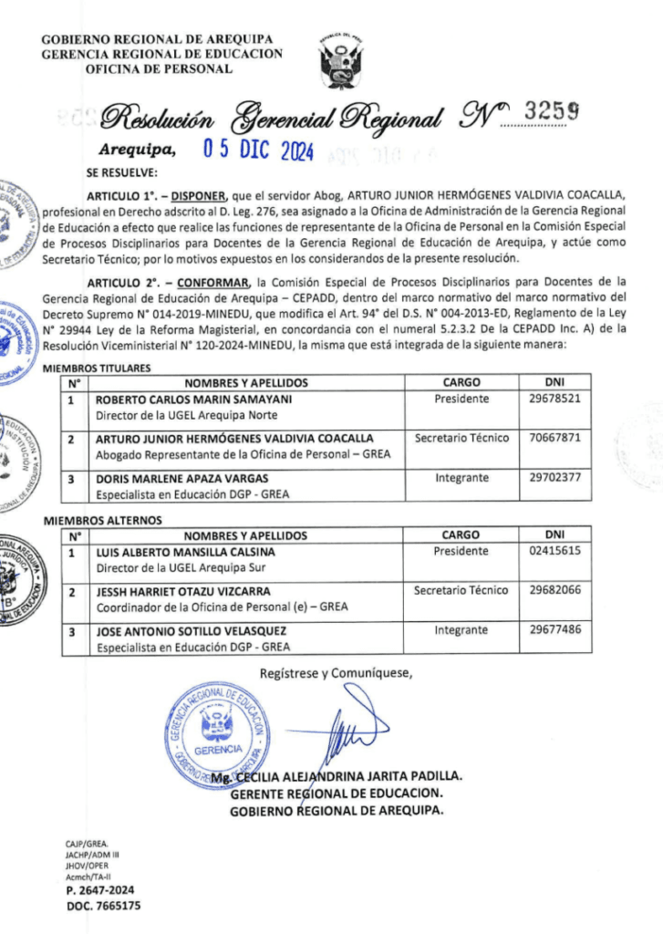Los funcionarios fueron nombrados como miembros de la Comisión Especial de Procesos Disciplinarios para Docentes (CEPADD), mediante la Resolución Gerencial Regional N° 3259, emitida el 5 de diciembre del 2024 por la gerente regional de Educación, Cecilia Jarita Padilla. El documento normativo designa a Roberto Marín como presidente titular y a su homólogo Luis Mansilla como presidente alterno (suplente).