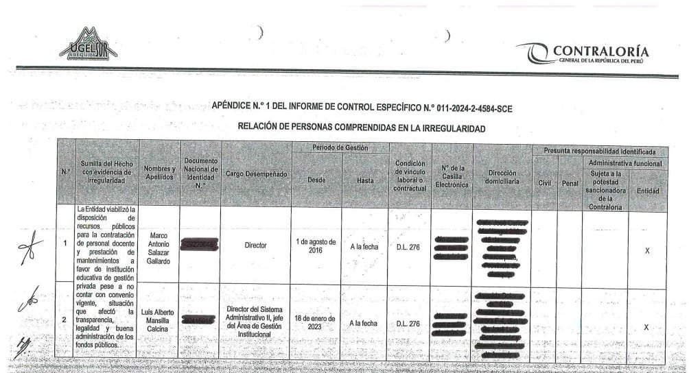 El titular de la Ugel Sur, Luis Mansilla Calsina, tampoco se encuentra libre de polvo y paja. El informe de Control Específico N° 011-2024-2-4584-SCE, elaborado por la Contraloría General de la República (CGR), revela que el docente tuvo participación en la disposición de recursos públicos para contratar personal docente y prestación de mantenimientos a favor de una institución educativa privada. Este hecho irregular genera un perjuicio a la institución y afectó la transparencia, legalidad y buena administración de los fondos públicos.