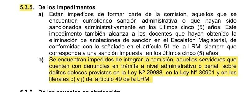 Si bien al momento de su nombramiento en estos cargos no tenían denuncias internas formales, ahora que cargan cuestionamientos están impedidos de seguir en la CEPADD. Y es que de acuerdo a la Resolución Viceministerial N° 120-2024-MINEDU, se encuentran invalidados de integrar la la comisión aquellos servidores que cuenten con denuncias en trámite a nivel administrativo o penal, sobre delitos dolosos previstos en la ley N° 29988.