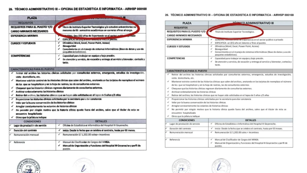 Inicialmente, las bases del concurso exigían para la mayoría de las plazas técnico-administrativas contar con título de Instituto Superior Tecnológico y/o estudios universitarios de al menos seis semestres académicos. No obstante, los nuevos perfiles restringieron la postulación únicamente a egresados de institutos superiores, excluyendo de manera directa a profesionales con formación universitaria. Adicionalmente, se eliminó el grado de bachiller como requisito, a pesar de haber sido considerado en las bases originales.