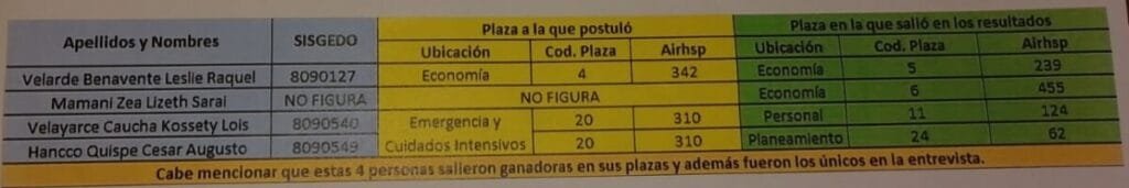 Por otro lado, Kossety Velayarce Caucha y César Hancco Quispe concursaron para ingresar al área de Emergencia y Unidad de Cuidados Intensivos, pero les otorgaron otras plazas. Colocaron a la primera como ganadora en un puesto de Personal; mientras que asignaron al segundo a una plaza de Planeamiento. Lo que incrementa la sospecha de manipulación es que todos fueron los únicos en las entrevistas personales.