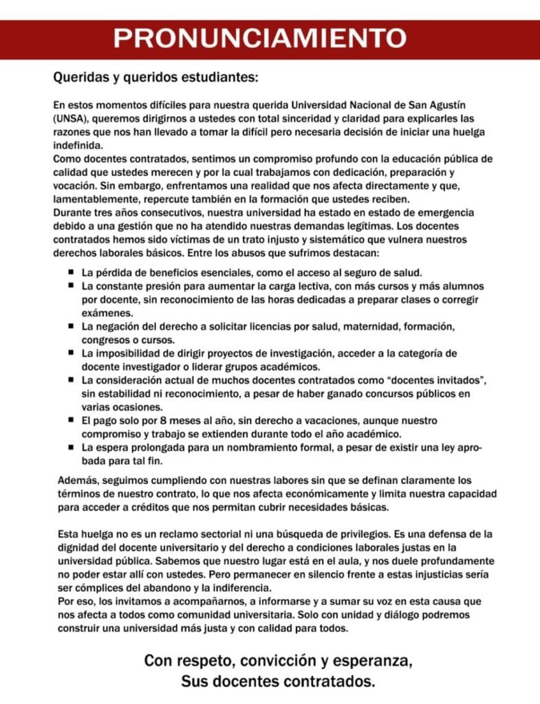 El pronunciamiento, inicialmente, más que dirigirse a las autoridades de la UNSA, hace un llamado a la empatía de los estudiantes. «Los docentes contratados hemos sido víctimas de un trato injusto y sistemático que vulnera nuestros derechos laborales básicos», se acusa en el documento.