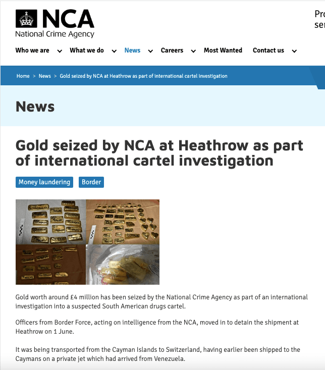 La Confederación Suiza reconocía en el informe Comercio del oro producido en violación de derechos humanos que no estaba en capacidad de garantizar que al país no llegaran cargamentos de oro conflictivo, etiqueta que se estampa a los metales relacionados con el crimen, esclavitud moderna, financiamiento de conflictos bélicos, trata de personas y trabajo infantil, aparte de la destrucción del medio ambiente y atropello de los pueblos autóctonos. “No puede descartarse que el oro cuya producción atenta contra los derechos humanos esté llegando a Suiza”, se leía en el documento, publicado en 2019.