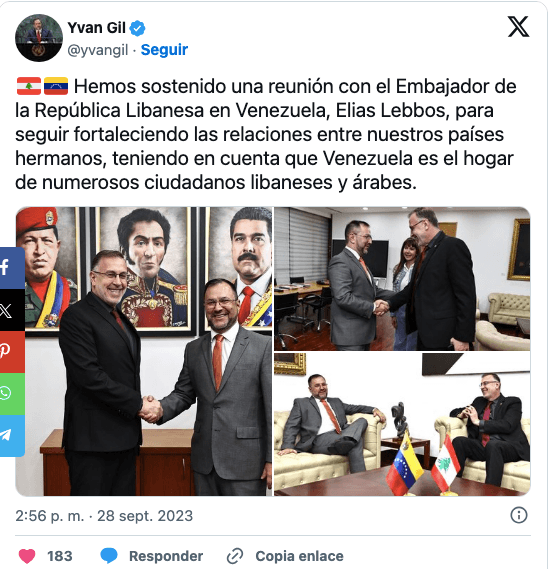 La reunión más reciente entre altas autoridades de Líbano y Venezuela tuvo lugar en Caracas, en septiembre de 2023. En esa ocasión el canciller venezolano, Yván Gil, recibió al embajador libanés, Elias Lebbos, en un salón adornado con los consabidos retratos de Chávez, Bolívar y Maduro, según las imágenes difundidas por el ministerio de Relaciones Exteriores a través de la red social X, antes Twitter. De acuerdo al comunicado oficial, la reunión tuvo lugar a fin de “seguir fortaleciendo las relaciones entre los dos países hermanos”. Aunque esa fórmula diplomática no explicitaba si en aquella oportunidad los funcionarios trataron el tema del intercambio comercial binacional, específicamente el del oro, lo cierto es que el negocio continuó, viento en popa.