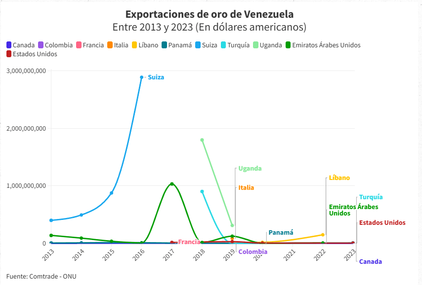 Hasta 2016, año de la creación del Arco Minero del Orinoco, el principal comprador oficial del oro venezolano era Suiza, país que entre 2013 y 2016 importó de Venezuela 122,9 toneladas, valoradas en 4.653 millones de dólares, según ONU-Comtrade. De ese total, al menos 8,8 toneladas, equivalentes a 201 millones de dólares. fueron vendidas a Suiza por el BCV, de acuerdo a la base de datos de comercio internacional Importgenius.