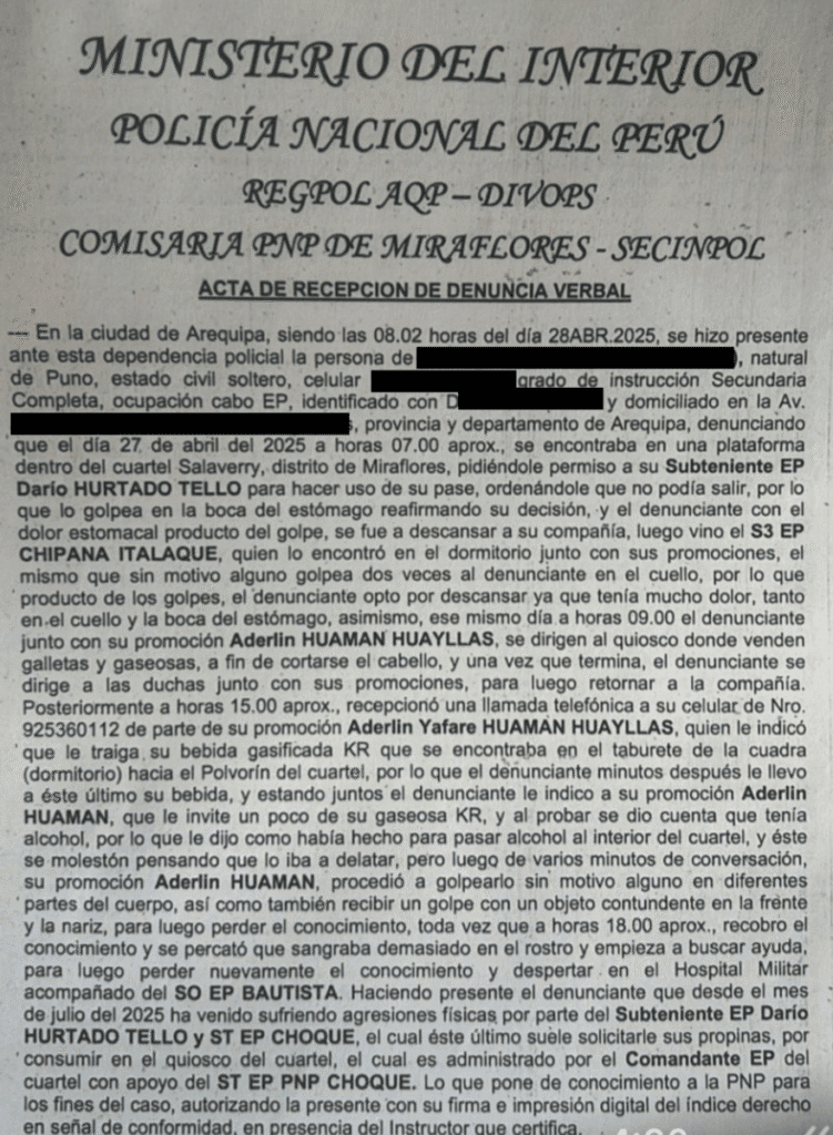 Revelación.pe se comunicó con el cabo agraviado, quien confirmó las agresiones a las que fue sometido dentro del cuartel. En un breve diálogo, señaló que se encontraba pasando los exámenes médicos correspondientes y solicitó una investigación exhaustiva contra los involucrados.