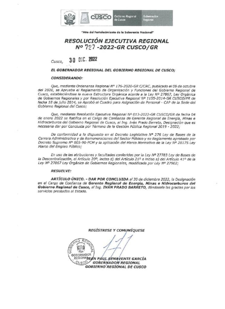 El exfuncionario del gobernador Sánchez emitió la referida constancia laboral el 31 de diciembre del 2022. No obstante, su cargo en el Gobierno Regional (Gore) de Cusco terminó el 30 de diciembre del 2022. Así consta en la Resolución Ejecutiva Regional N° 727-2022-GRCUSCO/GR, firmada por el entonces gobernador Jean Paul Benavente García. Por lo que el documento no tendría validez, al ser expedida cuando ya no ejercía funciones. Incluso, habría incurrido en el presunto delito de usurpación de funciones.