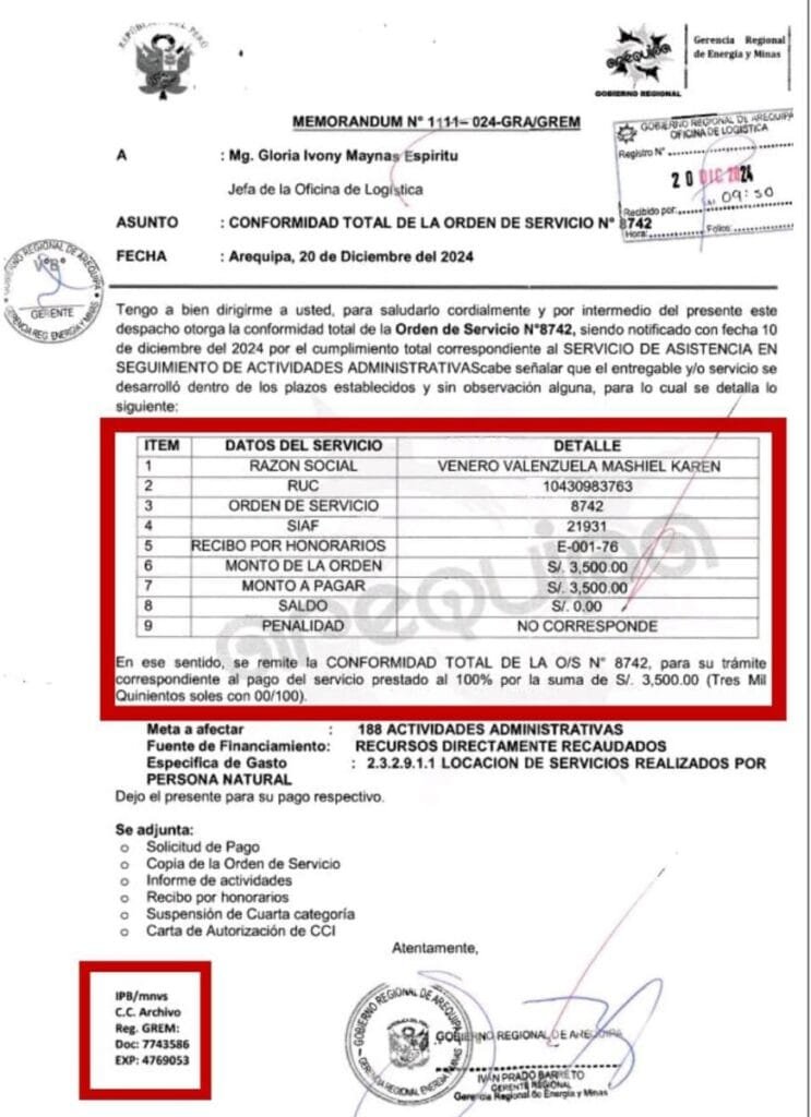 Orduña Manga hoy se desempeña en labores administrativas en la GREM. Desde que inició su relación con el Gobierno Regional de Arequipa el 21 de junio del 2024 hasta la actualidad, facturó 25 mil soles en total. Sin embargo, también existen irregularidades en sus informes que justifican sus honorarios. Pues se consigan actividades que no fueron objeto de su contratación y otras que no cumplió.