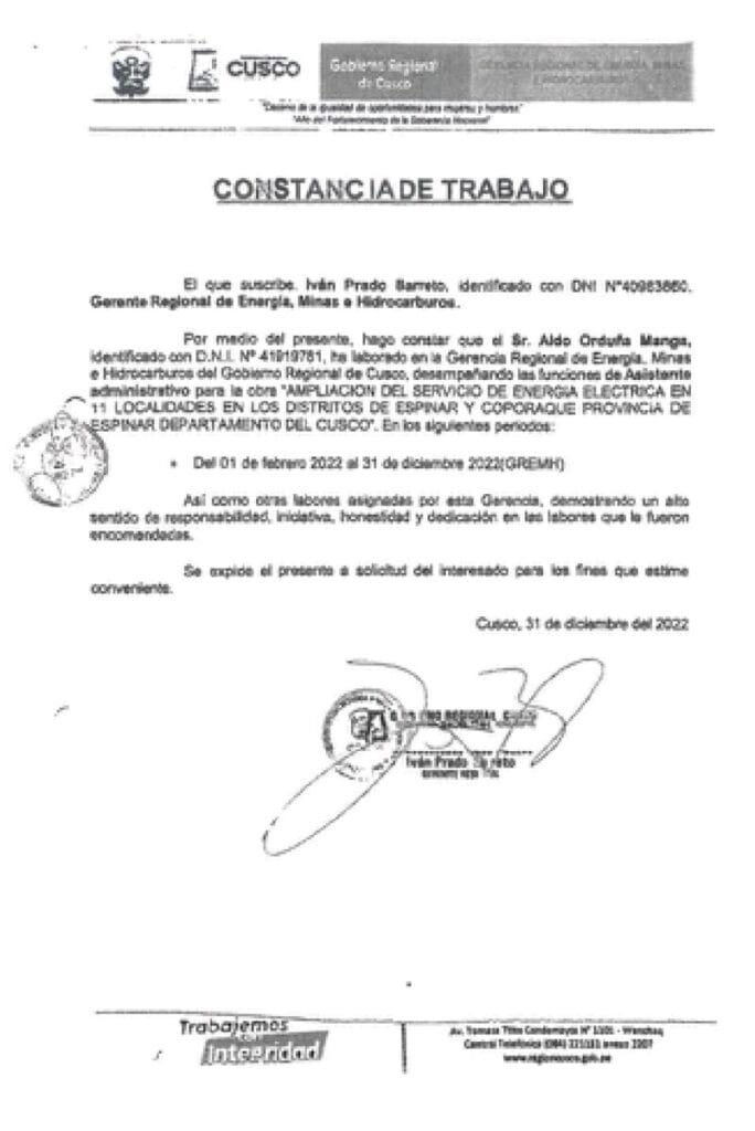 Iván Prado Barreto no puede negar su relación con estos servidores, en especial con Aldo Orduña Manga. Y es que él mismo le firmó una constancia de trabajo que sirvió para engrosar su currículum vitae previo a su contratación en Arequipa. En este certificado, se le reconoce su labor como asistente administrativo de la obra “Ampliación del servicio de energía eléctrica en 11 localidades de los distritos de Espinar y Coporaque”, desde el 1 de febrero del 2022 hasta el 31 de diciembre del mismo año.