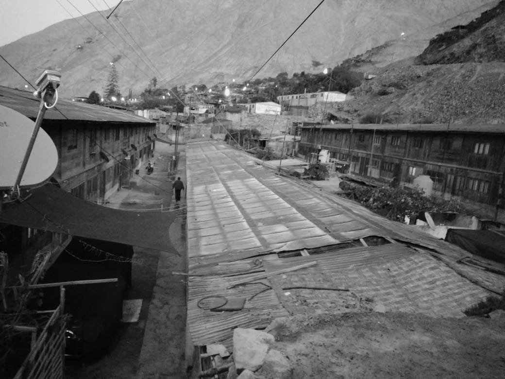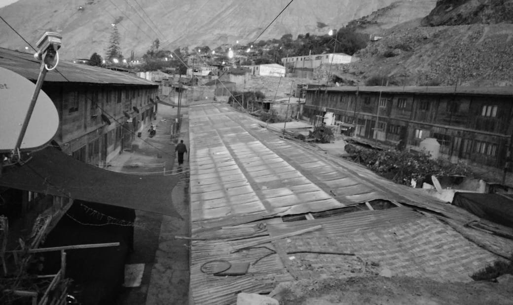 Los buses van llegando pese a la lluvia, otros quedan varados al extremo de la ribera. Y por el altavoz general se da aviso del imposible ingreso al asentamiento minero a causa del huayco. Consiguientemente, vuelven los goterones en los techos y las familias se organizan para colocar baldes y ollas en lugares estratégicos y así evitar una inundación. En el transcurso las ratas felpudas son descubiertas huyendo despavoridas a buscar refugio en los huertos frutales y gallineros empolvados. Los pocos adolescentes que juegan fulbito en la loza deportiva terminan empapados y se citan al siguiente día, a la misma hora, para continuar con el partido y saldar la apuesta. Entonces, los ancianos, sentados en los bloques de cemento, tienden sus mantas al aire y se cubren la cabeza. Se levantan, con dificultad en las rodillas, carajeando el mal tiempo y observan a su alrededor confusos las cenizas en el aire hasta dar con el basural incendiado cerca al cementerio que sirve para dividir la parte alta y baja del pueblo.