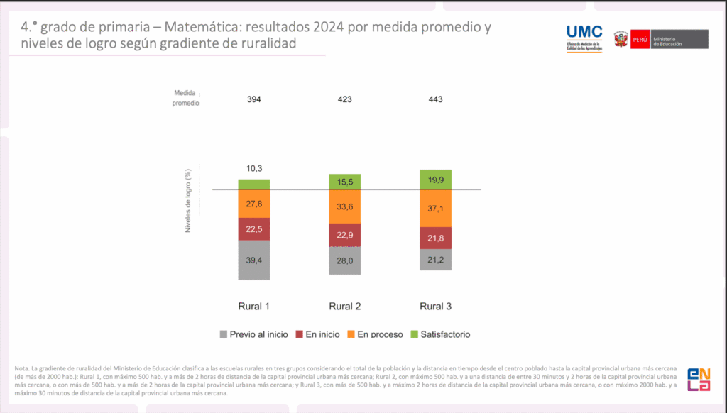 Si bien en los resultados de la ENLA 2024 las escuelas de las zonas rurales amazónicas muestran mejoras, esto no es un avance considerable pues en comparación con otras regiones siguen ocupando los últimos lugares. Y si nos adentramos en las comparativas entre las mismas categorías de ruralidad las estadísticas decaen aún más.