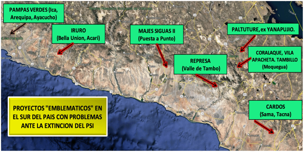 Entre los que se consideran “huérfanos” porque ya no existiría el apoyo del PSI, están los proyectos de Moquegua como ex Yanapujio, y las promocionadas 3 represas de Moquegua. Además de los proyectos de la margen derecha de Rio Tumbes, Chonta-Cajamarca, Chavimochic, Chinecas, Alto Piura, Concón-Topara, Pampas Verdes y Cardos en Tacna. Y en Arequipa, Tambo, Iruro, Majes Siguas II, entre otros.
