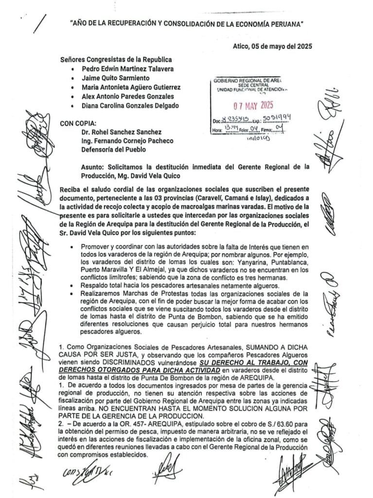 Por estos argumentos, el gerente David Vela Quico ya no tiene respaldo de los pescadores artesanales. El documento advierte posibles marchas con participación de todas las organizaciones sociales de la región. El problema se agudiza tras la inasistencia del funcionario a las reuniones de trabajo programadas para frenar la crisis.