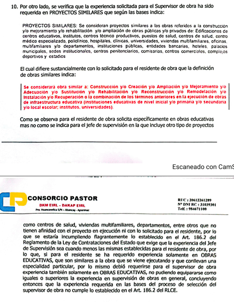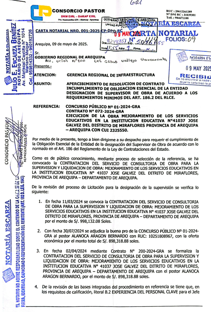 La carta notarial N° 001-2025-CP-DPO-RC advierte que el 30 de julio del 2024, la entidad adjudicó la buena pro para este servicio de consultoría a Bernardo Alanoca Aragón, por un monto equivalente a 898 mil 318 soles. Sin embargo, dicho postor incluyó al arquitecto Miguel Ángel Gonzales Rodríguez como supervisor, pero este, indica la denuncia, no cumple los requisitos mínimos establecidos. Es decir, no cuenta con la experiencia necesaria para brindar estos servicios.