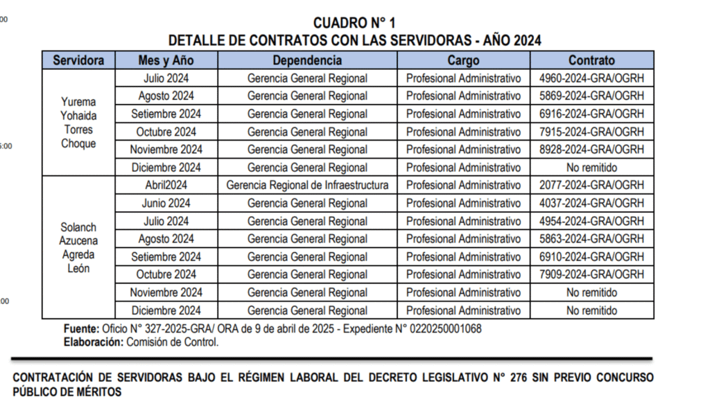 De acuerdo al último informe de la Contraloría General de la República (N° 4139-2025-CG/GRAR-AOP) Yurema Yohaida Torres Choque y Solanch Azucena Agreda León trabajaron de forma irregular en el GRA. Entre julio y diciembre de 2024, en el caso de Torres Choque, y entre abril y diciembre del mismo año, por parte de Agreda León.