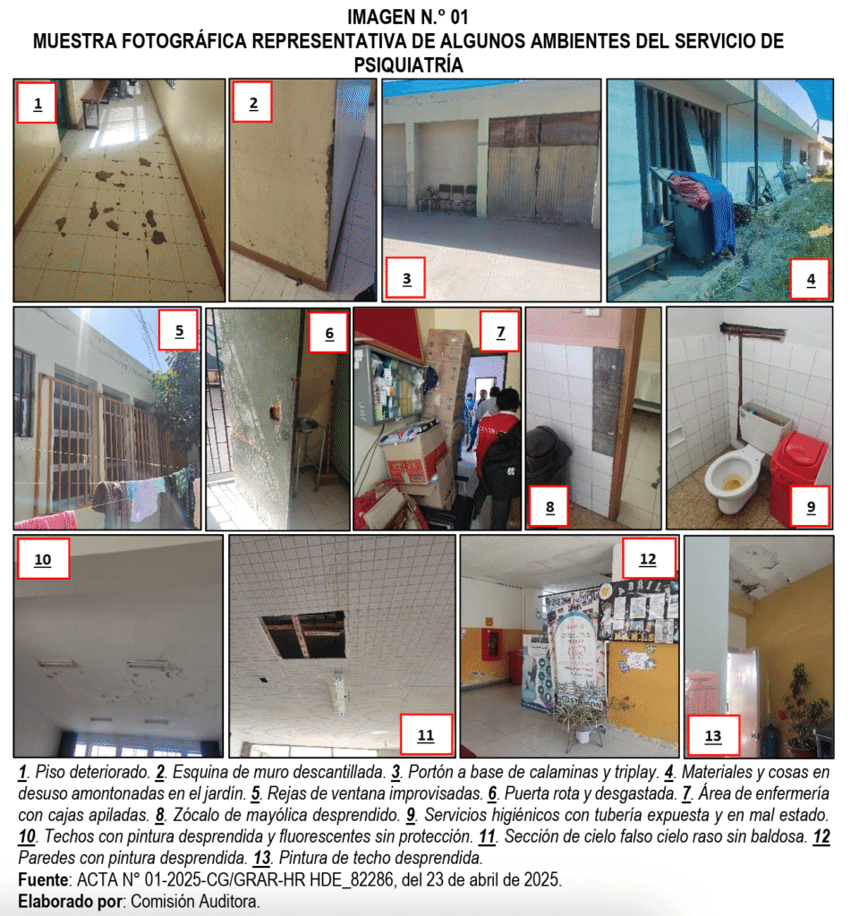 Lejos de ser un espacio de sanación, las deficiencias estructurales, la falta de mantenimiento y la desorganización en el equipamiento del área de Psiquiatría del hospital Honorio Delgado Espinoza, crean un ambiente que, paradójicamente, pone en riesgo la salud mental y la recuperación de los pacientes. Estas deficientes condiciones de mantenimiento de sus ambientes contravienen los estándares de cuidado.