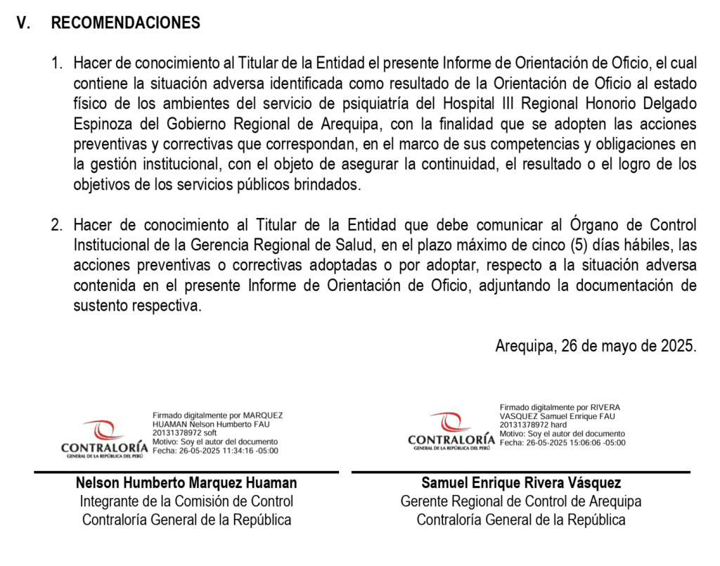La Contraloría General de la República (CGR), a través de su informe de Orientación de Oficio N° 4304-2025-CG/GRAR-SOO, dio a conocer los resultados de una inspección física realizada a las instalaciones el 23 de abril del 2025. La exploración reveló defectos en los pasillos, salas de hospitalización, tópicos, oficinas, consultorios, áreas de emergencia, cuidados intensivos, entre otros.