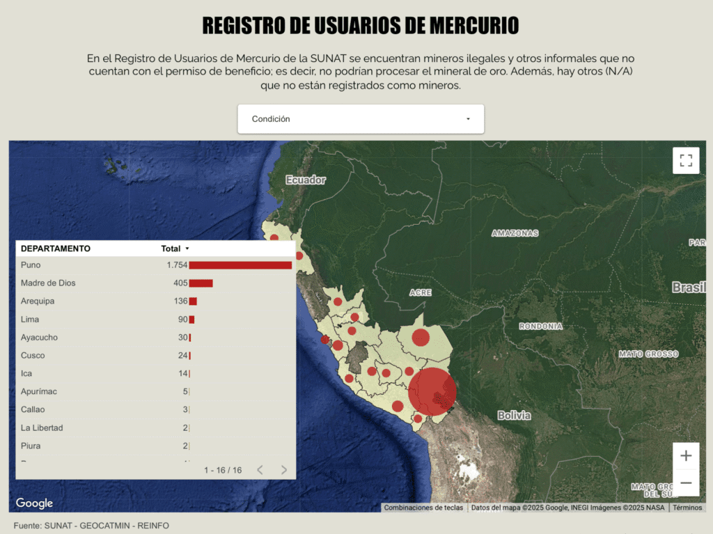 De acuerdo a informes de la Superintendencia Nacional de Aduanas y de Administración Tributaria (Sunat) y del Ministerio del Interior, en el Perú hay almacenadas 3184,5 toneladas de mercurio, debido a las importaciones realizadas antes de la regulación de su uso. Además, en 2023 y 2024 se autorizó la importación de más de 6 toneladas cada año para su uso en la industria farmacéutica e insumos químicos. Sin embargo, una parte termina en la minería ilegal e informal. Pancarta.pe y CONNECTAS comprobaron que el 46 % de los usuarios registrados por el Estado son mineros ilegales o sin concesiones de beneficio. Es decir, que carecen de un permiso para procesar el mineral y obtener oro.
