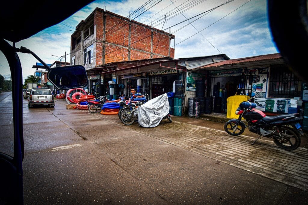 Son las 10 de la mañana y el movimiento económico en “Puerto” —como le dicen sus habitantes— ya está en auge. Turistas, comerciantes de productos amazónicos, motos y mototaxis alimentan el bullicio. La mayor parte del comercio está en las calles, donde se ubican ferreterías que abastecen de cuanto insumo se pueda imaginar para la minería informal e ilegal, que se da en los ríos y bosques de Madre de Dios. Desde mangueras hasta motobombas para absorber la arena del fondo de los ríos; también baldes, bidones, alambres y otras herramientas. Hay de todo en los anaqueles. Incluso se puede pagar con pepitas de oro, de la producción del día anterior.